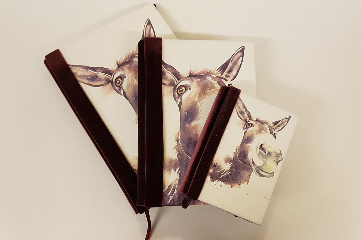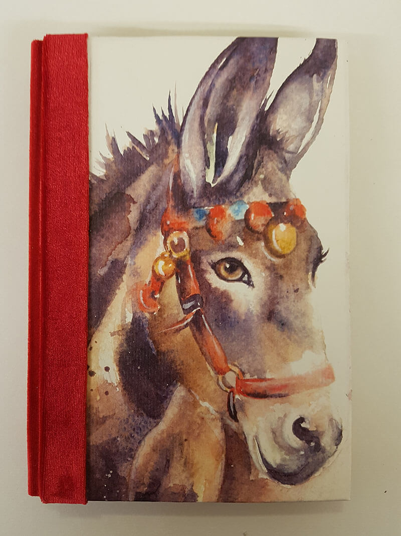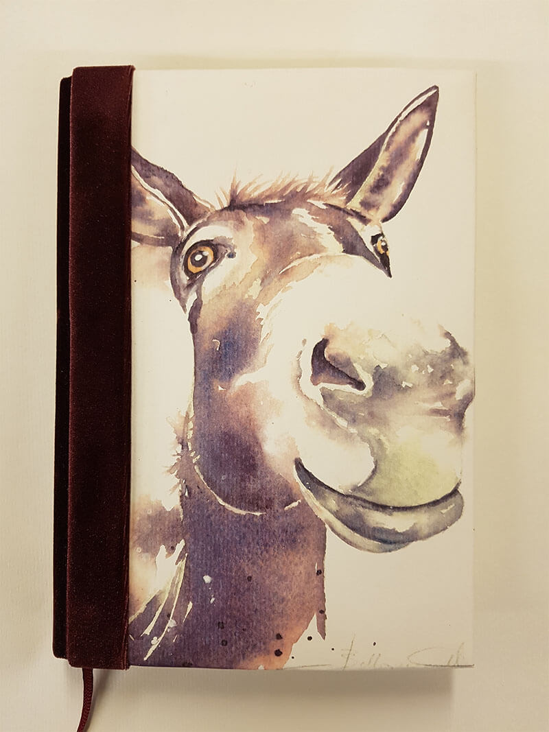 Grazie alla collaborazione con Paola Bellaminutti, acquarellista di chiara fama, sono nati questi diari che riportano in copertina i ritratti di due asinelli Bardato e Smile. L’accostamento con il tessuto in velluto ha reso ancor più preziosi i volumetti